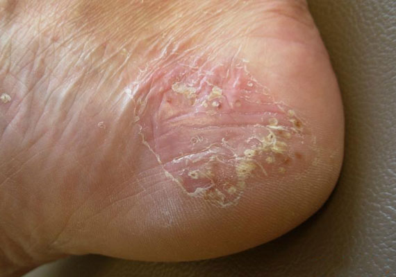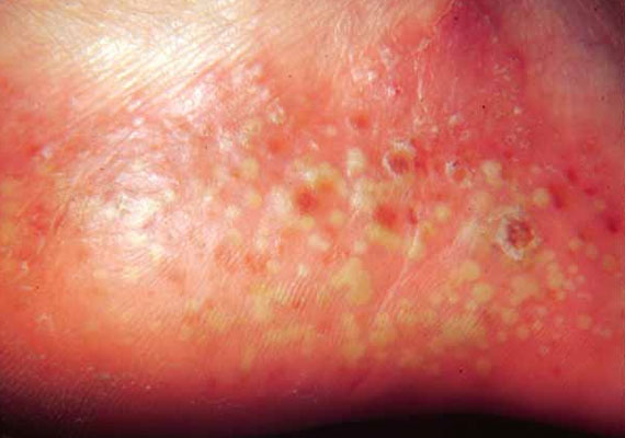 脓疱型牛皮癣图片显示它会在患者的皮肤上引起充满脓液的水疱或脓疱。