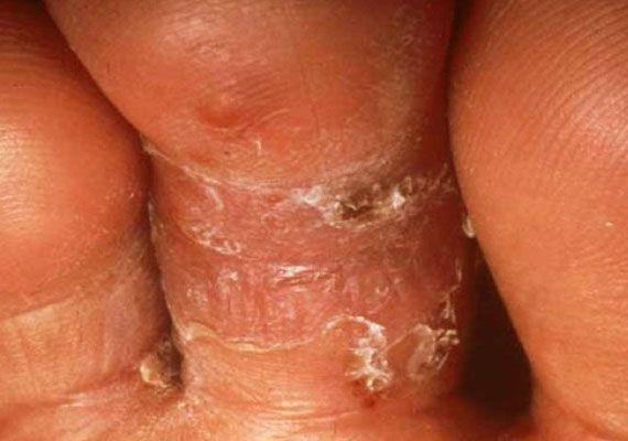 足癣的症状照片图片样子显示皮肤剥落或鳞屑;瘙痒可能很严重;脚上出现粉红色或红色皮疹;脚趾之间的皮肤会裂开等足癣的症状。其治疗包括外用抗真菌药膏和口服抗真菌药。